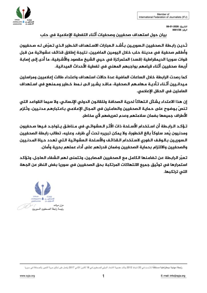 تُدين رابطة الصحفيين السوريين بأشد العبارات الاستهداف الخطير الذي تعرّض له صحفيون وأطقم صحفية في مدينة حلب خلال اليومين الماضيين، نتيجة إطلاق قذائف عشوائية من قبل قوات سوريا الديمقراطية (قسد) المتمركزة في حيي الشيخ مقصود والأشرفية، ما أدى إلى إصابة أربعة صحفيين أثناء قيامهم بواجبهم المهني في تغطية الأحداث الميدانية.